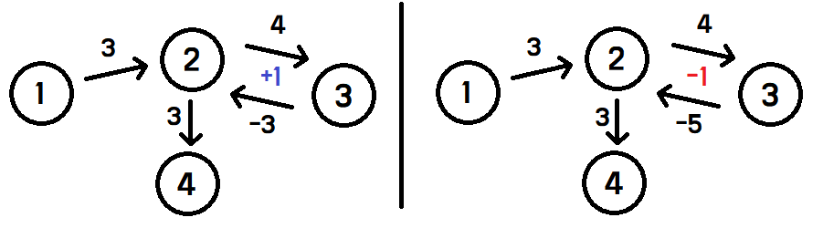 양쪽 그림 모두 2 > 3 > 2로 가는 사이클이 존재하지만, 좌측은 합이 +1, 우측은 합이 -1이다.