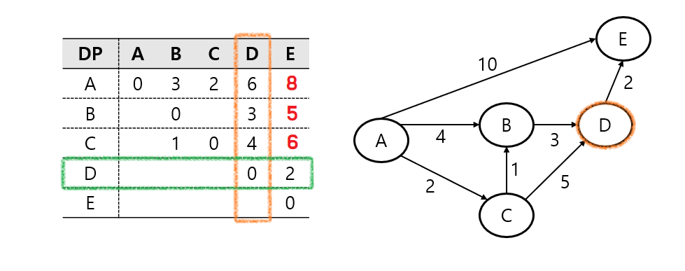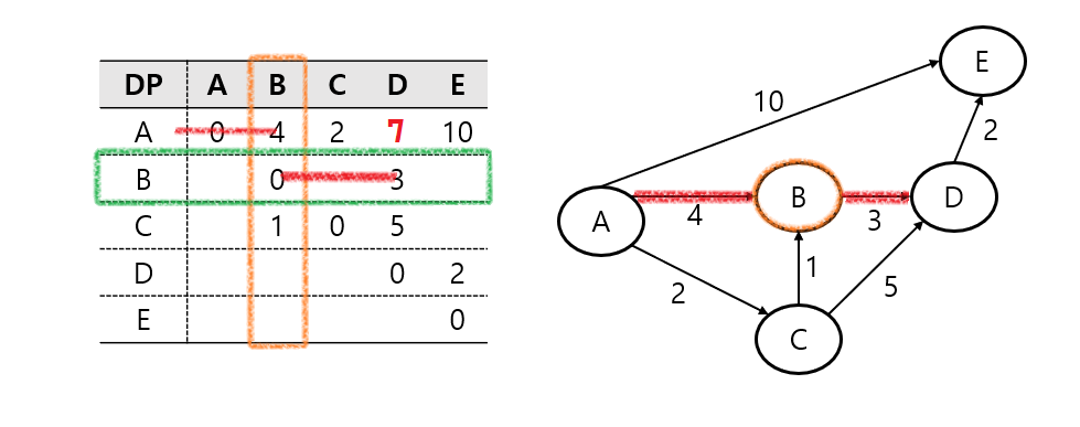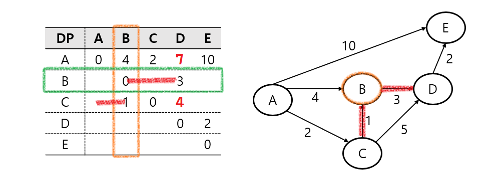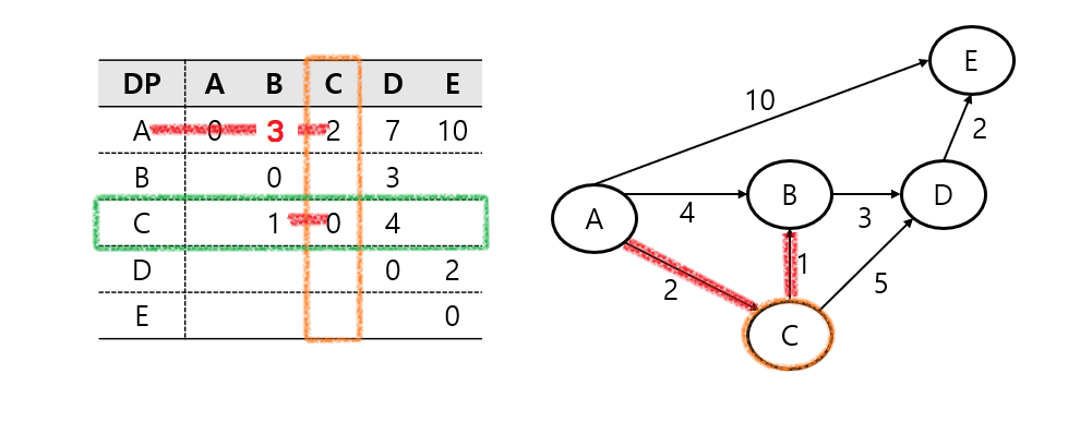 다음으로 C - B와 B - D를 확인할 수 있고, 이는 기존 C - D 보다 작은 값이기 때문에 DP를 업데이트한다.