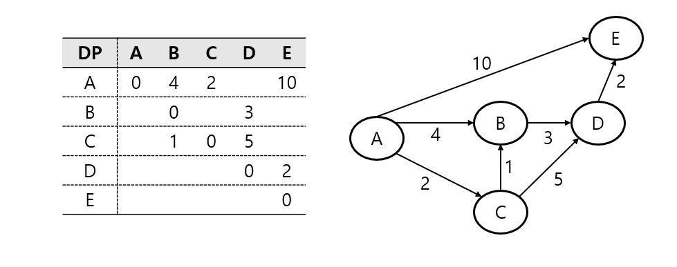 - DP 2차원 배열을 각 정점 사이의 가중치로 초기화한다. 가중치가 없는 경우 INF (Integer.MAX_VALUE)로 설정한다.