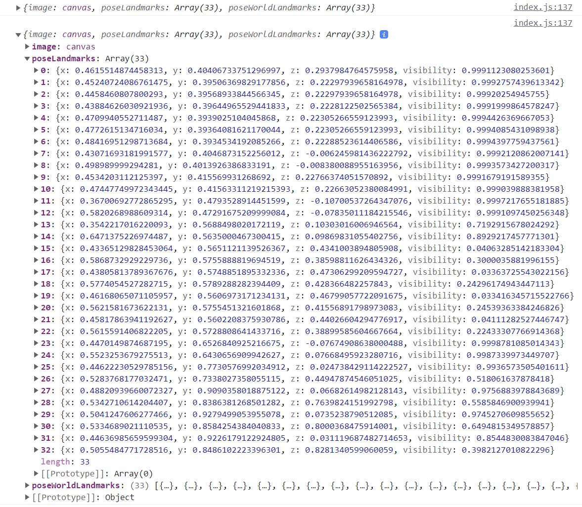 poseWorldLandmarks에서는 사람 기준에서의 x, y, z 좌표와 visibility 점수를 제공한다.