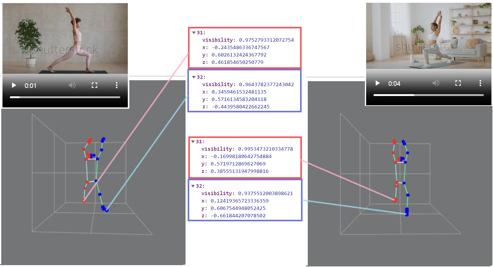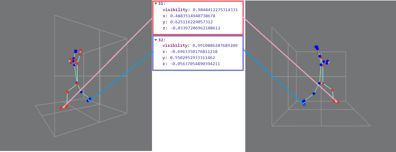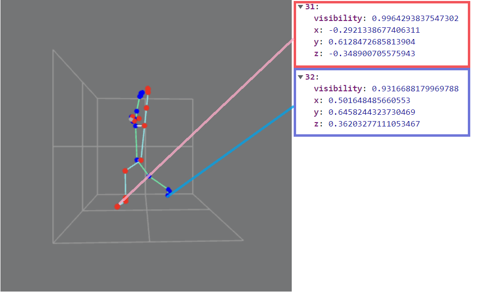 이제, 분석 결과를 보자. 두 발(31,32)의 z좌표(카메라부터 얼마나 먼 지)가 비슷하고, 엉덩이를 기준으로 오른쪽에 위치한 31번 발의 x좌표가 양수임을 확인할 수 있었다.