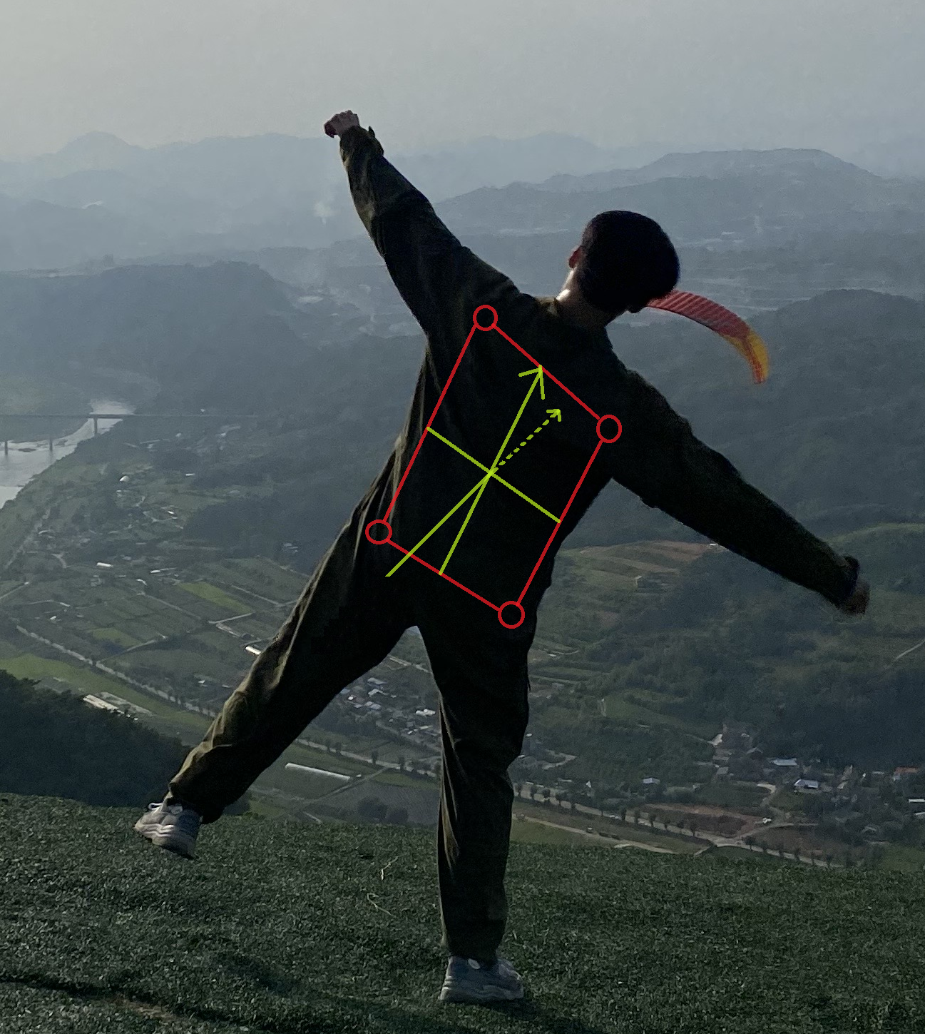 가장 먼저 Y축을 구하기 위해, 어깨 중앙점과 엉덩이 중앙점을 구하고, 벡터의 차를 이용하여 Y축을 정의하였다.