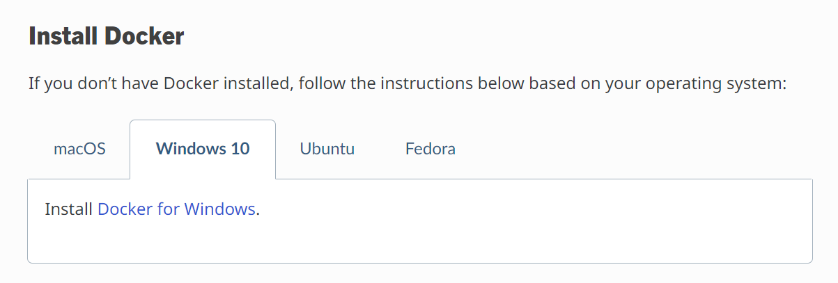만약 Docker가 없다면, 스크롤 위쪽에 위치한 Install Docker에서 맞는 버전을 다운로드하여 설치한다.