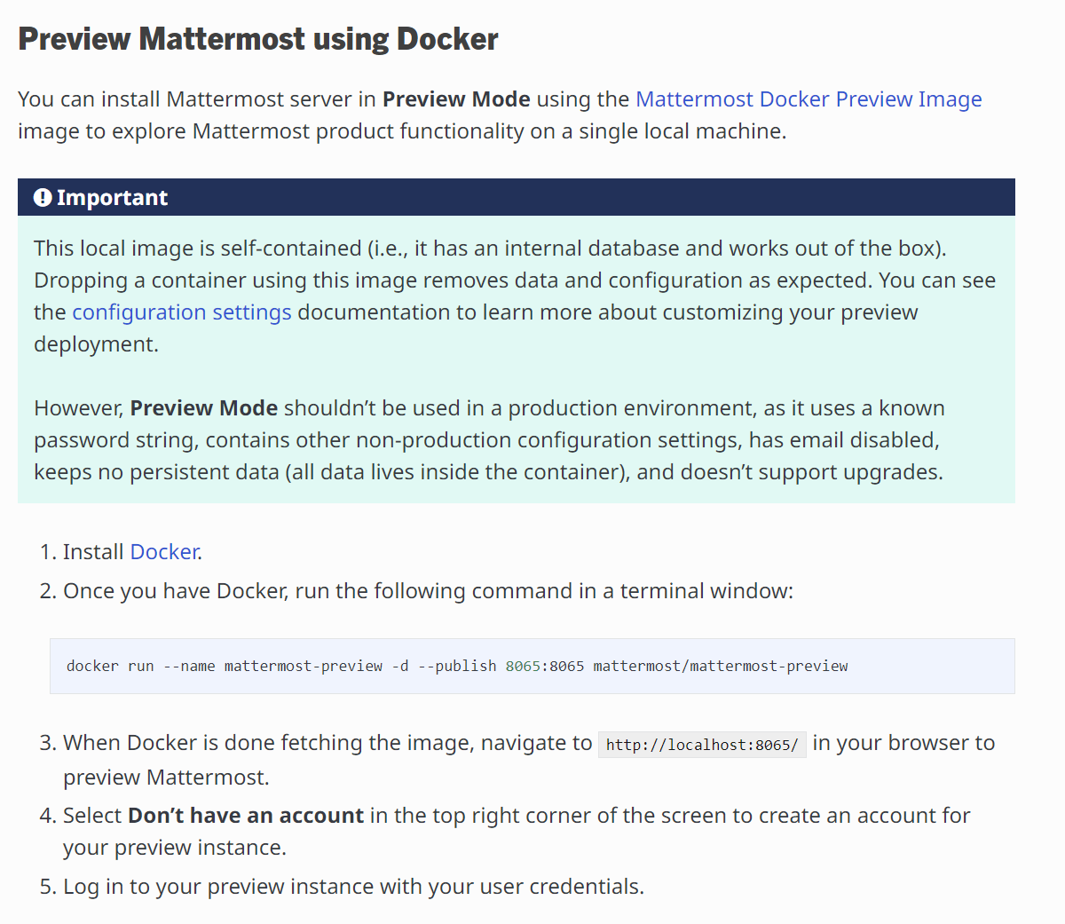 docker run --name mattermost-preview -d --publish 8065:8065 mattermost/mattermost-preview