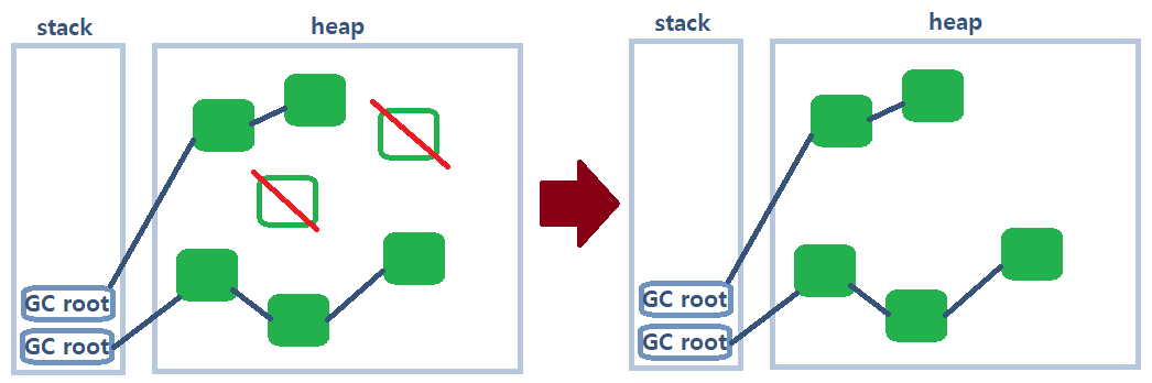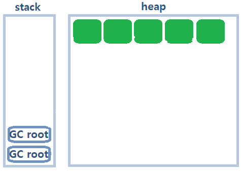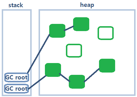 예를 들어, Stack영역의 변수들은 Heap영역의 객체를 참조한다. 이때, Stack 영역의 변수가 GC root가 된다.