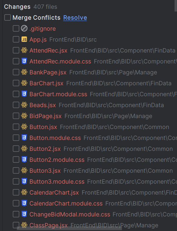이렇게 두 옵션을 사용하여 Merge를 진행하였고, 당연히 Conflicts가 발생하였다.