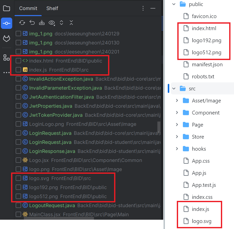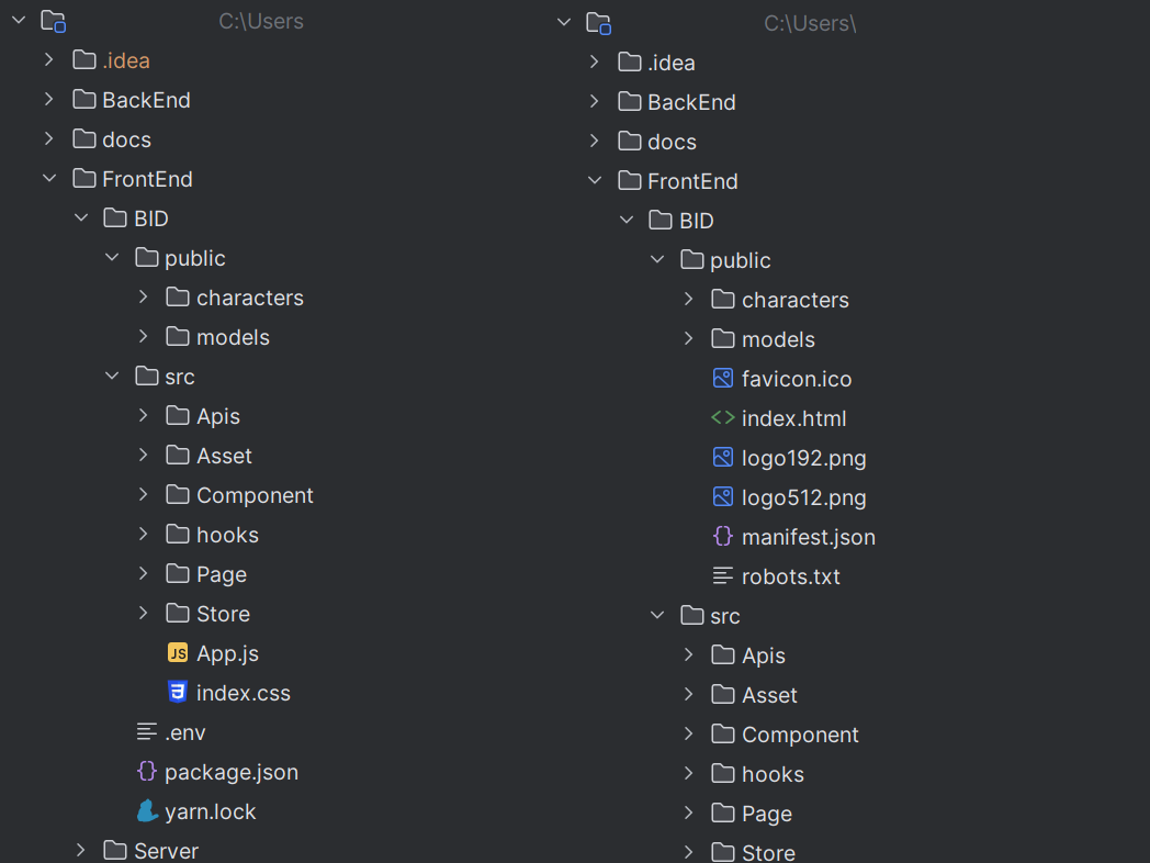 React 프로젝트로 checkout을 하면 우측 사진과 같이 프로젝트 파일들이 보인다. 하지만 Merge를 진행하면서 왼쪽 사진과 같이 파일들이 사라지는 에러였다.