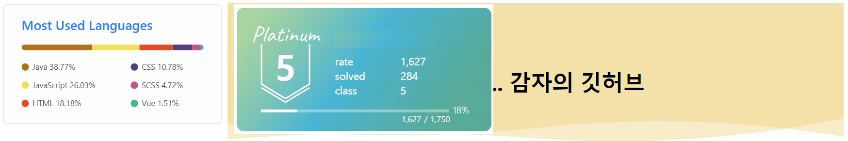 그래서 이 것을 해결할 만한 방법이 없을까 고민을 하던 도중, 위와 같은 리드미 꾸미기 위젯들이 눈에 밟혔다. 이런 위젯들은 사용 기술의 분포가 얼마나 되는지, 내 백준 프로필은 어떤지, 내가 얼마나 깃허브 활동을 했는지 등등 많은 형태로 존재하고, 꽤나 효과적으로 데이터를 제공해 준다고 생각한다.